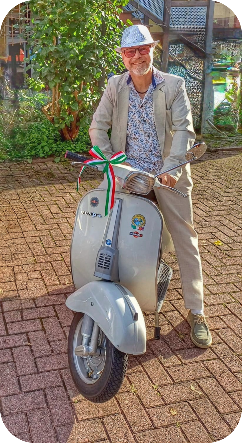 Otto, Bj. 74 – Seit 3 Jahren begeisterter Vespa-Fahrer. Ich habe mich von 50ccm über 125ccm bis hin zu 300ccm gesteigert und gemerkt, wie die Lust am Fahren immer größer wird. Noch viel besser ist es, dabei tolle Leute wie die Rusty Helmets kennenzulernen! Paolo ist unser "Leitschaf" (ja, auch ein bisschen verrückt), der uns mit tollen Ausflügen und Projekten immer wieder begeistert. Ich unterstütze ihn mit meinen Ideen – und treibe ihn damit manchmal fast in den Wahnsinn 😜 Ein riesiges Dankeschön Ciccio, dass du mich dabei aushältst! 😅