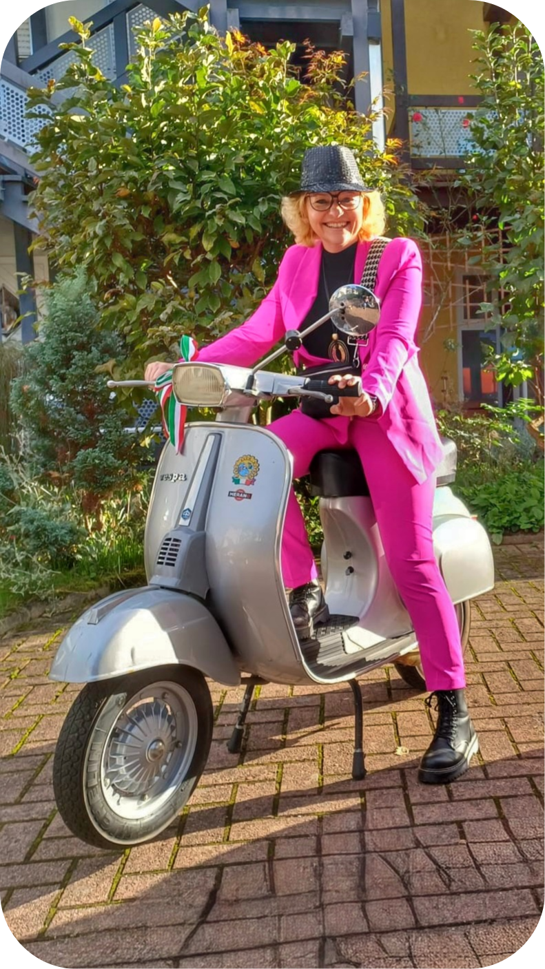 Regina 2019 hat's Klick gemacht: Mein Leben brauchte mehr Stil, mehr Italien – und definitiv mehr Zweitaktduft! Dieses Jahr dann der Höhepunkt: Meine pinke Vespa GTS ist eingezogen und thront jetzt wie eine Diva in meiner Garage. Elegant, auffällig, und ehrlich gesagt, pinker als jedes Einhorn.